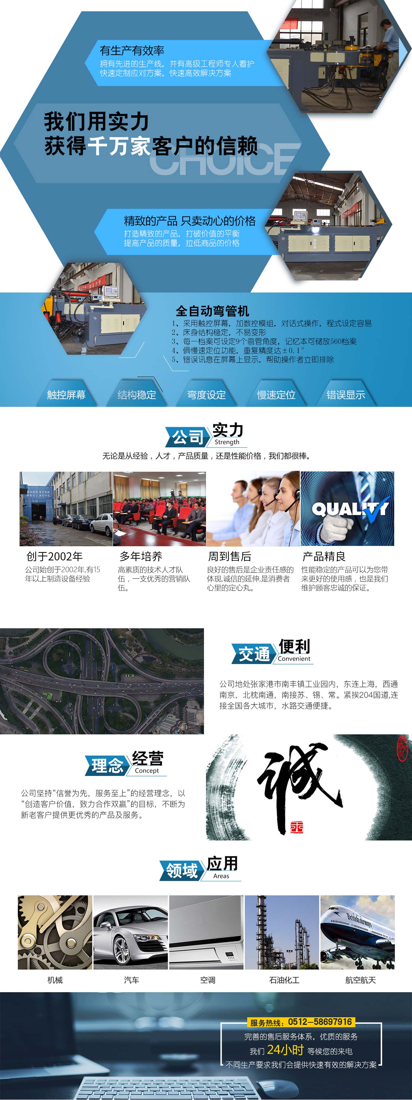 張家港市雙和機械制造有限公司始建于2001年,占地面積12000平方米,南鄰蘇州、無錫、上海,東鄰常州、南京,交通便利,位長三角中間地段,風景優(yōu)美的張家港。 雙和公司至創(chuàng)立開始,引進了國外的設計制造理念,組建了企業(yè)生產(chǎn)管理優(yōu)秀團隊,致力于管材加工機械研發(fā)、設計、制造。創(chuàng)新的設計理念,嚴格的質(zhì)量把關,專業(yè)的售后服務,不斷提升了我在整個行業(yè)的影響力。 雙和公司生產(chǎn)的系列產(chǎn)品分為彎管機、切管機、縮管機、磨齒機、伺服彎管機、數(shù)控彎管機、液壓彎管機、自動切管機、管端成型機、倒角機、大弧滾圓機、鋁切機、壓彎機等管材加工機械,廣泛用于航天業(yè)、造船業(yè)、汽車制造、鍋爐制造、自行車、摩托車、體育健身器材、管制品家...